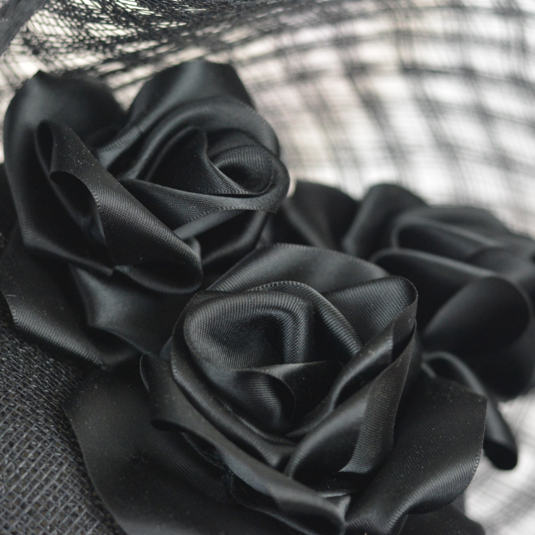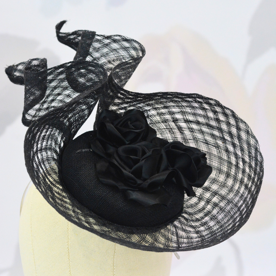 Kathy is a striking percher hat designed to captivate with its bold, asymmetric wave of basket weave sinamay. This dramatic element creates a sense of movement and flair, making it a true statement piece. The hat is further adorned with handcrafted silk roses, adding a touch of timeless elegance and softness to the overall design. Perfect for those looking to make a dramatic yet refined impression, Kathy beautifully blends modern style with classic millinery craftsmanship.