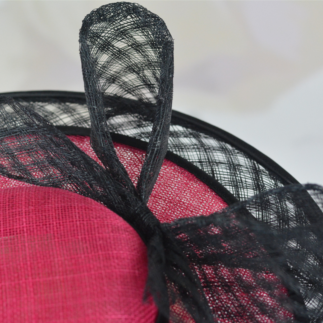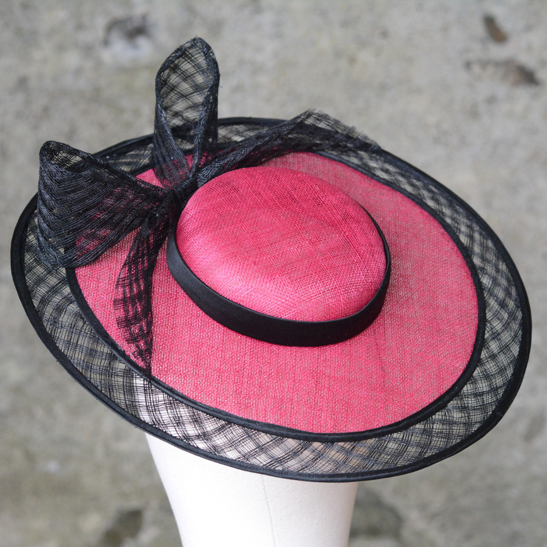 Megan is a vibrant cerise pink boater-style hat that combines bold colour with sophisticated details. This striking piece features a black woven sinamay trim that adds a touch of contrast and elegance, beautifully framing the hat’s classic flat crown and wide brim. A matching black woven bow further enhances the design, adding a playful yet refined accent. Megan is perfect for those who want to make a stylish statement with a blend of modern flair and timeless charm.