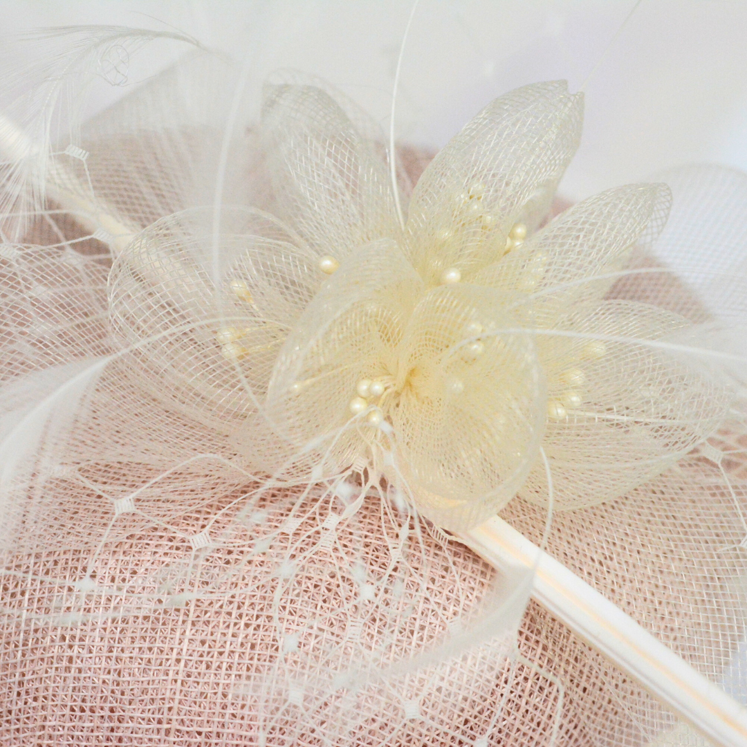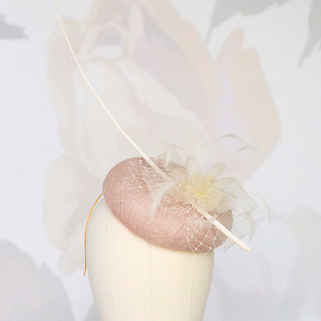 Pipa is a delicate blush pink button percher that exudes subtle elegance and femininity. This charming headpiece is beautifully adorned with a light embellishment of fine netting, adding a touch of texture and allure. Soft feathers gracefully accent the design, enhancing its gentle, airy appeal. Pipa is the perfect choice for those seeking a refined and sophisticated accessory that offers just the right amount of detail without overpowering the overall look.
